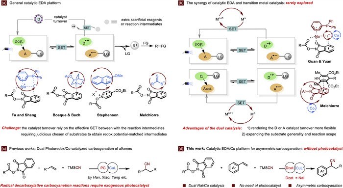 | Scheme 1. (a) Classical catalytic EDA complexes. (b) The concept of incorporated catalytic EDA with transition metal catalysis. (c) Previous work on photoreodox/Cu dual-catalyzed carbocyanation of alkenes. (d) This study: developing dual EDA/Cu catalytic platform for asymmetric carbocyanation. | |