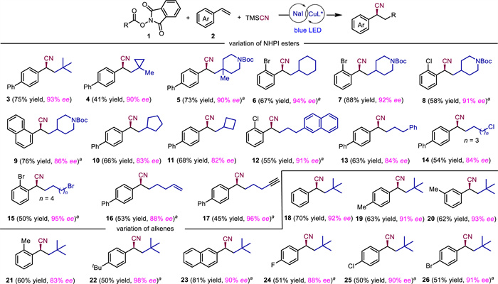 Having established the optimal reaction conditions for this enantioselective radical relay process, we began to investigate the scope generality of the radical precursors (Scheme 2). A variety of bench-stable NHPI esters derived from readily available linear and cyclic alkylcarboxylic acids were all effective in this reaction, producing the corresponding chiral cyanide products in moderate to good yields and high enantioselectivities (3–17). A series of functional groups, such as halides, alkenes, alkynes, were well tolerated (14–17). In particular, alkyl NHPI ester bearing an alkyl bromide group reacted in exclusive site-selectivity with alkyl bromide untouched (15). The three-component radical transformation was not only compatible with tertiary and secondary alkyl radicals, but also tolerated more challenging primary alkyl radicals. It should be mentioned that this reaction showed broader scope of radical patterns and higher levels of enantiocontrols (> 90%). Next, the scope generality of alkenes was explored. Styrene reacted with high yield and high ee (18). Arenes bearing para substituents such as methyl (19), tert-butyl (22), and F (24), Cl (25), Br (26) functional groups proceeded smoothly with high enantioselectivity. Especially, the substrate bearing a para tert-butyl gave an excellent enantioselectivity (up to 98% ee). The enantiocontrol was sensitive to the steric hindrance as meta-methyl substituted styrene provided a comparable yield and a slightly higher ee (20), while steric hindered ortho-substituted variant gave a decreased ee (21). Besides, 2-vinylnaphthalene was also suitable substrate, which reacted smoothly with very high yield and good enantiomeric excess (23).