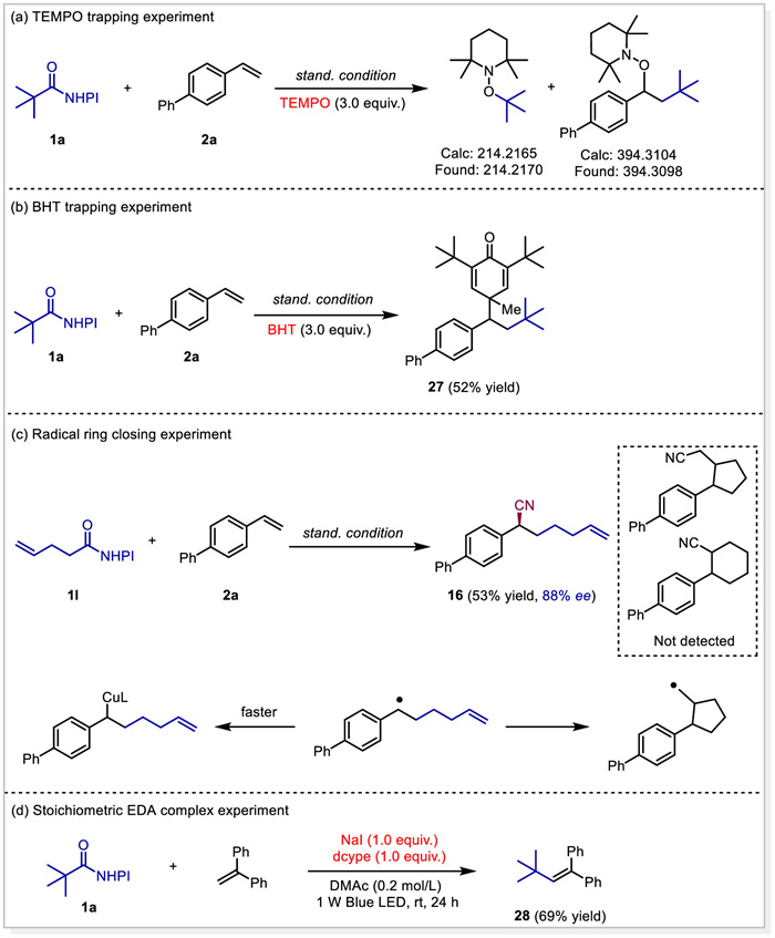 To understand the mechanism, several control experiments were conducted (Scheme 3). First, radical probe experiments were performed. The reaction was completely inhibited when adding radical scavenger TEMPO and the TEMPO-trapped adducts were detected by HRMS (Scheme 3a). Moreover, when adding BHT as radical scavenger, we could also isolate BHT-trapped adduct 27 in 52% yield (Scheme 3b). Both results provided evidence of radical pathway and the alkyl radicals originated from NHPI esters triggers the carbocyanation process. The radical cyanation of substrate 1l did not afford the ring-closed products, indicating the radical-organometallic cross-over perhaps be faster than the ring-closing step (Scheme 3c). The nonlinear effect experiment showed a linear relationship of the ee value of the product with the ee value of the ligand, suggesting the involvement of one single chiral ligand and one copper species in the enantio-determining step (Fig. 1a). To provide evidence for the formation of EDA complex between NHPI ester and NaI/dcype, UV–vis absorption spectroscopy measurements were performed. When mixing NHPI eater 1a and NaI/dcype in DMAc, an obvious red shift of the mixed components was observed in UV–vis absorption spectrum (Fig. 1b). This indicated the formation of EDA complex by assembly of NaI/dcype and NHPI ester. Besides, when running the reaction of NHPI ester with 1,1-diphenylethylene in the presence of 1.0 equiv. of NaI/dcype while removing Cu/L catalyst, the radical Heck-type reaction proceeded smoothly to afford 28 in 69% yield (Scheme 3d). All these together indicated that the intramolecular SET of the resulting EDA complex occurs to generate alkyl radicals.