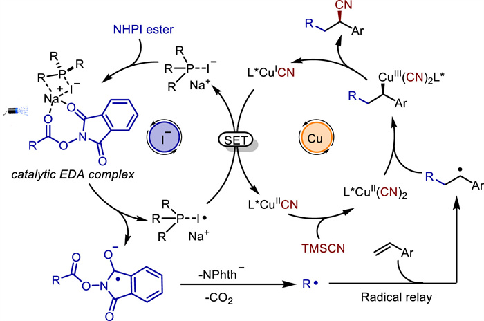 Based on the above mechanistic studies and literature reports [31–34,52], a plausible catalytic cycle was depicted (Scheme 4): Photoexcitation of the EDA complex by assembly of NaI, R3P, and NHPI ester triggers an SET event to get an alkyl radical and R3P-I• intermediate. The alkyl radical undergoes radical addition to styrene to give a more stable benzyl radical, which falls into copper-catalysed radical coupling process. In the copper catalytic cycle, a facile SET between CuⅠ(CN)L* and R3P-I• affords CuⅡ(CN)L* and regenerates NaI-PR3. The resulting CuⅡ species undergoes ligand exchange and radical recombination affords CuⅢ complex, reductive elimination of the resulting CuⅢ produces the final product and regenerates CuⅠ to close the copper catalytic cycle.