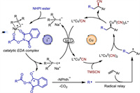 In conclusion, we have developed a novel decarboxylative carbocyanation reaction of alkenes by merging catalytic electron donor-acceptor (EDA) complex with copper catalysis. The reaction shows a broad scope of alkyl radical precursors. A series of primary, secondary, and tertiary alkyl radicals were tolerated to engage the asymmetric decarboxylative cyanation with good regio- and stereoselectivity. This dual EDA/Cu catalytic platform enables to obviate the need of photocatalyst for decarboxylative radical cyanation, thus providing new space for broad synthetic application of catalytic EDA complex photochemistry.