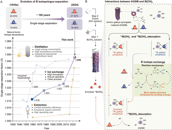 | Fig. 1. (A) The technical critical points of distillation and extraction methods occurred in 1958 and 2018, respectively, while this work suggests a technical critical point in the development of the ion exchange method. (B) The proposed schematic of the synergetic interactions of 10B(OH)3 and 11B(OH)3 adsorption, B isotope exchange, and 10B(OH)3 desorption. The relatively higher binding energy of 10B–galloyl complexes facilitates the isotope exchange reaction. | |