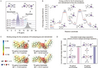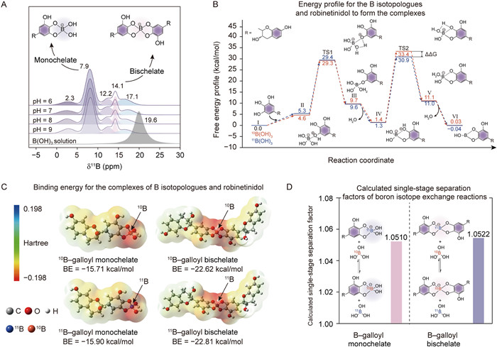 To investigate the mechanism of 10B isotopologue separation by AGSM, 11B MAS NMR showed five peaks in the spectra of AGSM after B(OH)3 adsorption (δ = 2.3, 7.9, 12.2, 14.1, and 17.1 ppm) ascribed to the B–galloyl complexes (Fig. 3A). Specifically, the two peaks in the spectra with chemical shifts at 7.9 ppm and 12.2 ppm were assigned to the monochelate and bischelate of B–galloyl complexes, respectively [58]. To further reveal the molecular interactions in the B–galloyl complexation, robinetinidol (containing a single galloyl group) was used to calculate the free energies (FE) and binding energies (BE) with B(OH)3 by DFT calculations. The complexation process of B(OH)3 and robinetinidol was carried out in two main steps (Fig. 3B), each of which was followed by the nucleophilic attack of the galloyl groups on the vacant orbital of the planar triangular B(OH)3, followed immediately by the proton transfer, and at which pointed it became a transition state and finally lose the H2O molecule [59]. In the first step of the reaction, the FE change of the transition state formed by 10B(OH)3 (29.3 kcal/mol) was slightly smaller than that of 11B(OH)3 (29.4 kcal/mol). While in the formation of second transition state, the FE of the transition state formed by 11B(OH)3 (30.9 kcal/mol) was significantly smaller than that of 10B(OH)3 (33.4 kcal/mol). These DFT calculations suggested that 11B was a more preferable species in B–galloyl complexes during the adsorption. The difference of thermodynamic stability of B–galloyl complexes could further promote the isotope exchange between 11B in 11B–galloyl complexes with 10B in 10B(OH)3. We noticed that in both monochelate and bischelate, the BE of 10B–galloyl complexes was higher than that of 11B–galloyl complexes (Fig. 3C). Meanwhile, the BE of the bischelate was much smaller than that of monochelate, indicating that the monochelate had favorable interactions with another galloyl group to form bischelate, which was in accordance with the experimental results of 11B MAS NMR.