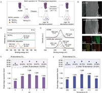 | Fig. 2. (A) Schematic diagram of the static separation performance of AGSM for 10B isotopologue from B(OH)3 solution (B concentration: 100 mg/L). (B) High resolution XPS B 1s spectra of the B(OH)3 and AGSM before/after adsorption. (C) High resolution XPS O 1s spectra of the AGSM before and after B(OH)3 adsorption. (D) SEM images of AGSM before and after B(OH)3 adsorption, and the EDS elemental mapping analysis of AGSM after B(OH)3 adsorption. (E) Effect of B(OH)3 solution with different pH values (5−9) on 10B isotopologue separation efficiency of AGSM. (F) Effect of different temperatures (283−323 K) on 10B isotopologue separation efficiency of AGSM. | |