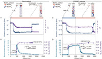 To demonstrate the feasibility and potential of large-scale deployment of AGSM in real-world, the performance of flowthrough separation of 10B isotopologue from B(OH)3 solution was evaluated in fixed-bed settings including the band method and the breakthrough and reverse-breakthrough (BT&RBT) methods, respectively. For the band method, B(OH)3 solution (5 mL, B concentration: 1080 mg/L) was added, and then the HCl solution (pH 1.5) was followed through the whole fixed-bed. The electronic conductivity and pH values of the effluents were monitored in real time (Fig. 4A). When the pH values were reduced from 7.0 to 4.5 and finally maintained at 4.5, the electronic conductivity was reduced to 20 µS/cm, due to the proton uptake capacity of amino groups on AGSM. Following the end point, the values of electronic conductivity and pH changed greatly in a short time due to the fully protonated amino groups.