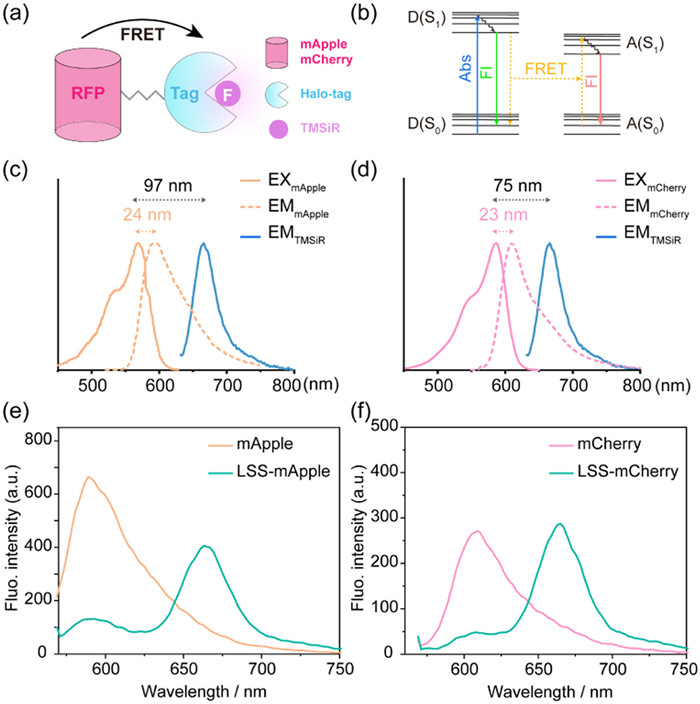| Fig. 1. (a) The schematic diagram illustrating the use of FRET strategy to construct far-red fluorescent proteins with large Stokes shift. (b) The Jablonski diagram depicting the processes of FRET. Normalized excitation (EX) and emission (EM) spectra of donor red fluorescent proteins mApple (c) and mCherry (d), along with acceptor dye TMSiR. Arrow texts illustrate the comparison of Stokes shift between wild-type RFPs and LSS-RFPs. (e) Fluorescence emission spectra of LSS-mApple with and without the addition of TMSiR. (f) Fluorescence emission spectra of LSS-mCherry with and without the addition of TMSiR. | |