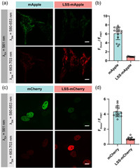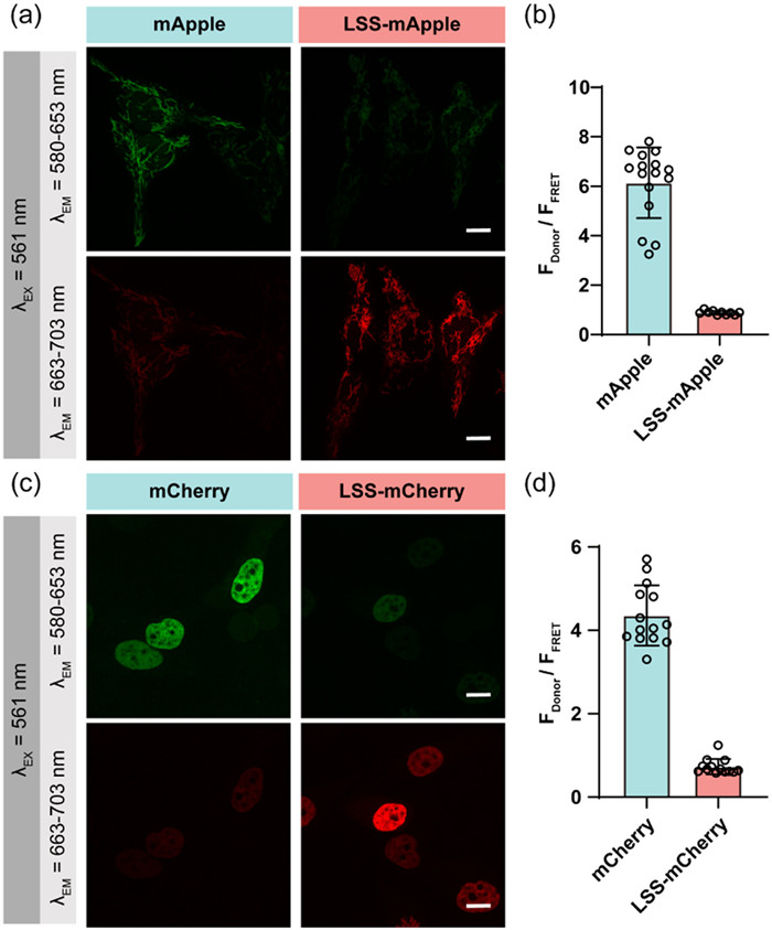 | Fig. 2. (a) Confocal fluorescence images of Tom20-mApple, and Tom20-LSS-mApple (labeled with TMSiR) expressed in HeLa cells, respectively, captured separately in the donor channel (excitation: 561 nm; emission: 580–653 nm) and FRET channel (excitation: 561 nm; emission: 663–703 nm). All channels were adjusted with the same contrast. Scale bar: 10 µm. (b) Fluorescence intensity ratio in the donor channel and FRET channel obtained from confocal fluorescence images described in (a). The graph shows the mean ± SD from 8–15 cells in three independent experiments. (c) Confocal fluorescence imaging of H2B-mCherry, and H2B-LSS-mCherry (labeled with TMSiR) with the same settings as in (a). Scale bar: 10 µm. (d) Fluorescence intensity ratio in the donor channel and FRET channel obtained from confocal fluorescence images described in (c). The graph shows the mean ± SD from 8–15 cells in three independent experiments. | |