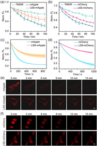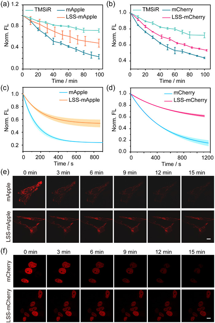 | Fig. 3. (a) Trends in maximum emission intensity of mApple (561 nm laser, λem = 590 nm), TMSiR-labeled LSS-mApple (561 nm laser, λem = 660 nm) and HaloTag-connected TMSiR (640 nm laser, λem = 660 nm) under continuous laser irradiation over time. (b) Trends in maximum emission intensity of mCherry (561 nm laser, λem = 610 nm), TMSiR-labeled LSS-mCherry (561 nm laser, λem = 660 nm) and HaloTag-connected TMSiR (640 nm laser, λem = 660 nm) under continuous laser irradiation over time. Each curve represents the average of three independent experiments ± SD. [protein]: 2 µmol/L. The comparative photobleaching dynamics of LSS-mApple (c), LSS-mCherry (d) and their respective parental proteins expressed in HeLa cells were captured through confocal fluorescence imaging under continuous illumination with 561 nm laser (33 mW) over time. Each curve represents the average of three independent experiments. (e) Confocal fluorescence images of LSS-mApple and parental mApple fused to Tom20 in HeLa cells at specified photobleaching time points. (f) Confocal fluorescence images of LSS-mCherry and mCherry fused to H2B in HeLa cells at specified photobleaching time points. Scale bar: 10 µm. | |
