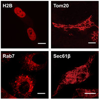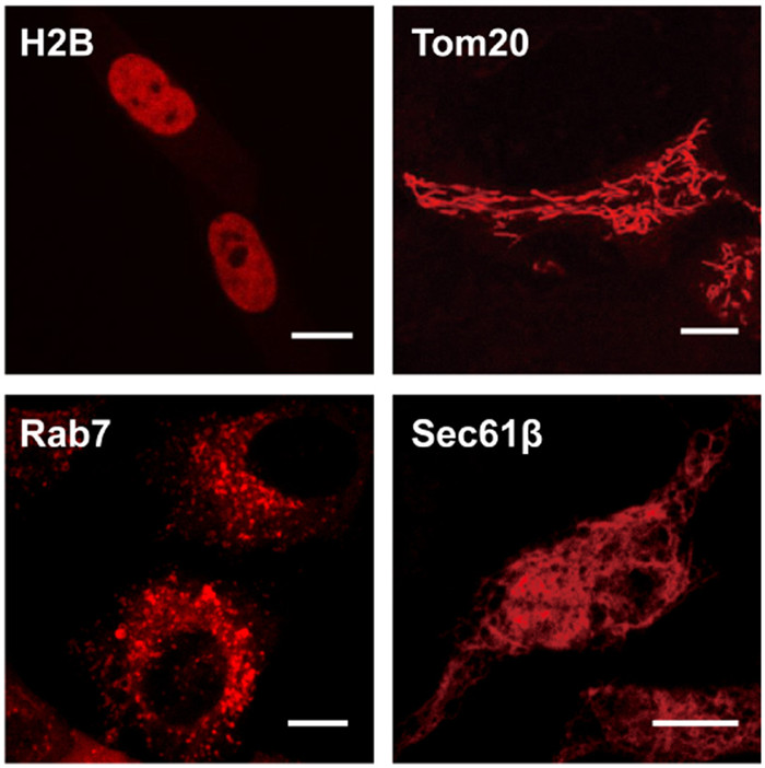 | Fig. 4. Confocal fluorescence images of LSS-mCherry fusion constructs targeting subcellular locations expressed in HeLa cells. H2B and Tom20 were fused to the N-terminus of LSS-mCherry. Rab7 and Sec61β were fused to the C-terminus of LSS-mCherry. Scale bar: 10 µm. | |
