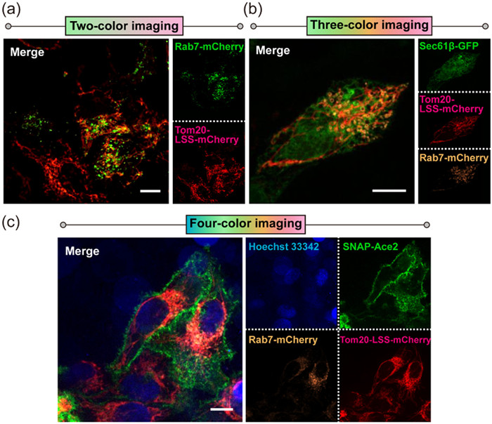 Next, we attempted to further expand to three-color and four-color imaging using LSS-mCherry. We co-expressed Sec61β-eGFP, Rab7-mCherry and Tom20-LSS-mCherry proteins in HeLa cells. Confocal fluorescence imaging was collected in green channel (λex = 488 nm, λem = 500–550 nm), red channel (λex = 561 nm, λem = 580–653 nm), and far-red channel (λex = 561 nm, λem = 663–703 nm), respectively. Under 488 nm and 561 nm excitation, we clearly observed three-color confocal imaging displayed the expected localization of three cellular structures: endoplasmic reticulum labeled with eGFP, lysosomes labeled with mCherry and mitochondria labeled with LSS-mCherry (Fig. 5b). And we noticed almost no crossover between the three channels. Furthermore, we co-expressed SNAP-Ace2, Rab7-mCherry and Tom20-LSS-mCherry proteins in HeLa cells. Then we added the commercial dyes Hoechst 33342 dye and SNAP-Surface Alexa Fluor 488 to stain the nucleus and cell membrane, respectively. Based on the settings of three-color channel, we increased a blue channel (λex = 405 nm, λem = 417–477 nm) for four-color confocal imaging. We successfully observed co-imaging of four labeled organelles: cell membrane, nucleus, lysosomes, and mitochondria in HeLa cells (Fig. 5c), all of which matched our expected imaging localization and had no crossover between the all channels.