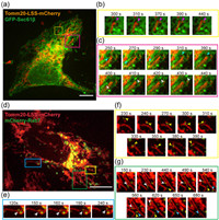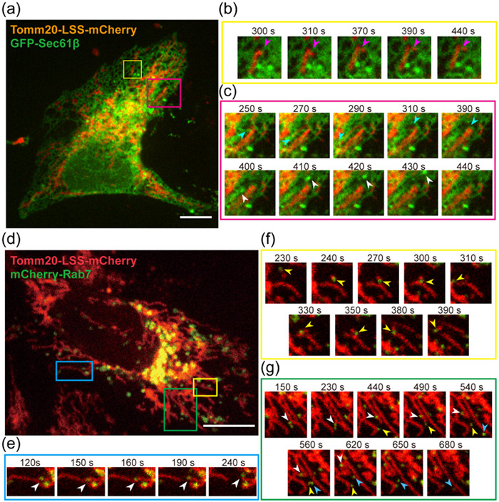 | Fig. 6. (a) Dual-color confocal images of HeLa cells co-expressing GFP-Sec61β and Tom20-LSS-mCherry. The endoplasmic reticulum and mitochondria are represented in green and orange channels, respectively. Scale bar: 10 µm. (b) Magnified images of the yellow-boxed region in (a). The pink arrow indicates the location where endoplasmic reticulum-induced mitochondrial fission event occurred. (c) Magnified images of the red-boxed region in (a). The blue arrows indicate the contact between mitochondria and the endoplasmic reticulum, while the white arrows denote vesicle movement induced by this contact event. (d) Dual-color confocal images of HeLa cells co-expressing mCherry-Rab7 and Tom20-LSS-mCherry. The lysosome and mitochondria are represented in green and red channels, respectively. Scale bar: 5 µm. (e, g) Magnified images of the blue-boxed and green-boxed region in (d). The two groups of images represent the two modes of action of lysosomes in the fission of mitochondria. (f) Magnified images of the yellow-boxed region in (a). (g) The image shows the multiple contact events between lysosomes and mitochondria. | |