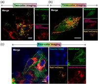 | Fig. 5. Multicolor imaging with LSS-mCherry protein. (a) Dual-color confocal image of co-expressing Rab7-mCherry and Tomm20-LSS-mCherry (labled with TMSiR) in HeLa cells. The left panel displays the separation channels of lysosomes (green) and mitochondria (red) under 561 nm excitation. The right panel shows the overlap of both channels. (b) Three-color confocal image of co-expressing Sec61β-eGFP, Rab7-mCherry and Tomm20-LSS-mCherry (labled with TMSiR) in HeLa cells. The left panel displays the separation channels of endoplasmic reticulum (green) under 488 nm excitation, lysosomes (orange) and mitochondria (red) under 561 nm excitation. The right panel shows the overlap of three channels. (c) Four-color confocal image of co-expressing SNAP-Ace2 (labled with Alexa Fluor 488 dye), Rab7-mCherry, Tomm20-LSS-mCherry (labled with TMSiR) along with staining Hoechst 33342 and in HeLa cells. The left panel displays the separation channels of nucleus (blue) under 405 nm excitation, cell membrane (green) under 488 nm excitation, lysosomes (orange) and mitochondria (red) under 561 nm excitation. The right panel shows the overlap of three channels. Scale bar: 10 µm. | |