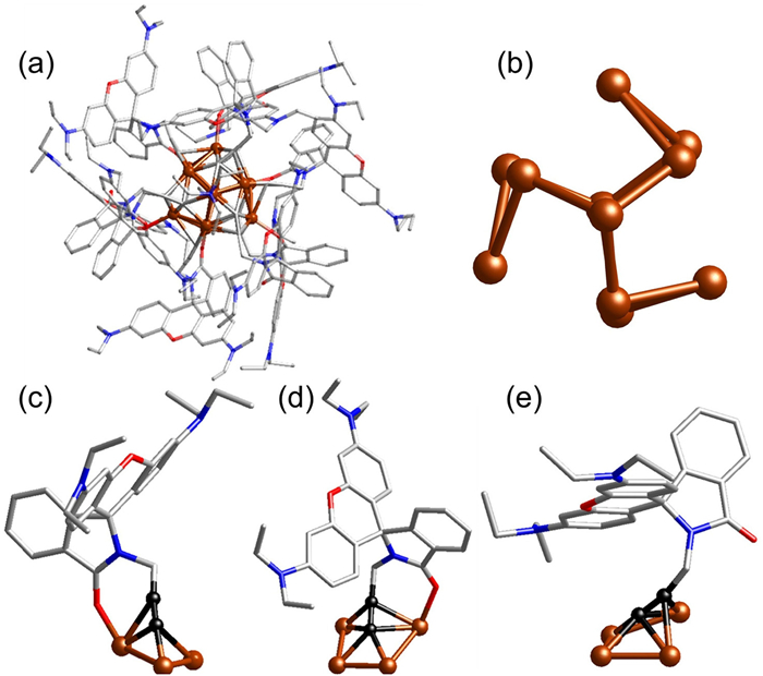 | Fig. 1. (a) The overall structure of Cu11. (b) The metal kernel in Cu11 with C3 symmetry. (c-e) The coordination modes of RB-CH ligands in Cu11 cluster. All hydrogen atoms are omitted for clarity, and the carbon atoms of the ethynide group are represented as small black spheres. Cu: brown, O: red, N: blue, C: gray. | |