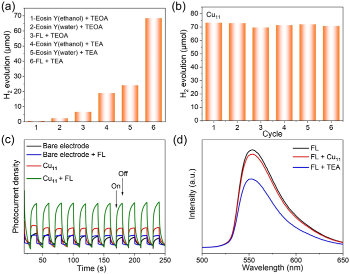 | Fig. 2. (a) Effect of different photosensitizer and sacrificial agent in the photocatalytic production. (b) The cyclic test performance of Cu11 cluster. (c) Transient photocurrent response of the bare glassy carbon electrode (black), bare glassy carbon electrode + FL (blue), pristine Cu11 (red) and FL + Cu11 (green). (d) Emission spectra of FL, FL + Cu11 and FL + TEA. | |