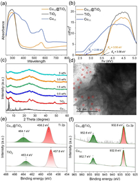 | Fig. 3. (a) UV–vis absorption spectra of Cu11, TiO2 and Cu11@TiO2. (b) The band gap of Cu11, TiO2, and Cu11@TiO2 calculated by UV–vis absorption spectra. (c) PXRD patterns of Cu11, TiO2, and Cu11@TiO2 with different loadings. (d) HRTEM images of Cu11@TiO2. (e) High-resolution Ti 2p XPS spectra of Cu11 and Cu11@TiO2. (f) High-resolution Cu 2p XPS spectra of Cu11 and Cu11@TiO2. | |