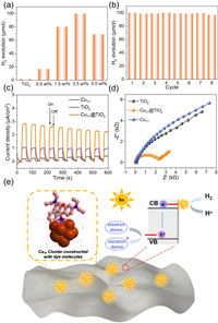 | Fig. 4. (a) Comparison of hydrogen evolution performance of Cu11@TiO2 with different Cu11 loadings. (b) The cyclic test performance of Cu11@TiO2. (c) Transient photocurrent response of Cu11, TiO2 and Cu11@TiO2. (d) EIS of TiO2, Cu11, and Cu11@TiO2. (e) The schematic diagram of the photocatalytic process of Cu11@TiO2 hybrid material. | |
