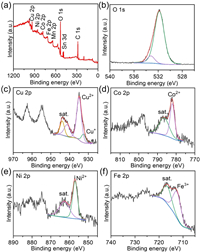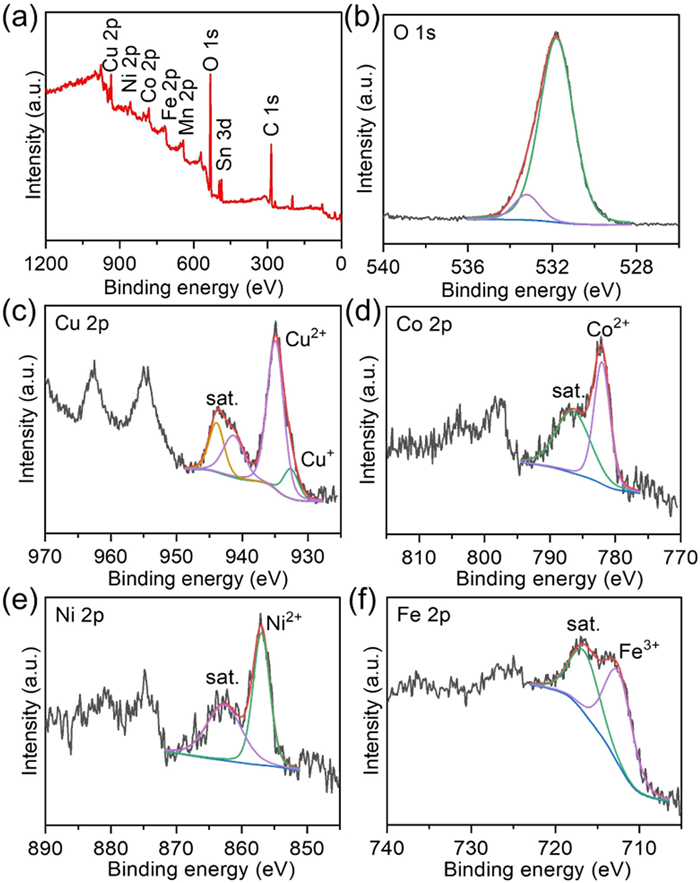 | Fig. 2. (a) XPS survey spectrum. (b) O 1s, (c) Cu 2p, (d) Co 2p, (e) Ni 2p and (f) Fe 2p XPS spectrum of HE-OH. | |