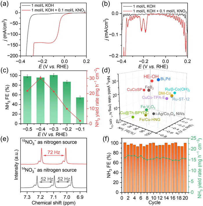 | Fig. 3. Electrocatalytic NO3RR performances of HE-OH. (a) LSV plots, (b) 6th harmonic component FTacV plot in 1 mol/L KOH with and without 0.1 mol/L KNO3. (c) NH3 FE and yield rate at different potentials. (d) Comparison of NH3 FE and yield rate between HE-OH and the reported electrocatalysts in similar conditions. (e) 1H NMR spectra of the electrolyte after electrolysis at −0.3 V with 15NO3− and 14NO3− as the nitrogen source. (f) Cycle stability test. | |