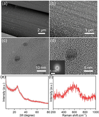 | Fig. 1. (a, b) SEM images, (c) TEM image, (d) HRTEM image (inset figure is the FFT pattern), (e) XRD pattern and (f) Raman spectrum of HE-OH. | |