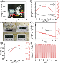 | Fig. 4. (a) OCV plot of HE-OH based Zn-NO3− battery (inset figure is the digital image of OCV). (b) Charging and discharging curves and the corresponding power density plot of HE-OH based Zn-NO3− battery. (c) The digital image of electronic timer powered by HE-OH based Zn-NO3− battery. (d) Discharging plots at different current densities. (e) NH3 FE and yield rate. (f) Charge and discharge process at the current density of 5 mA/cm2 for 10 h. | |