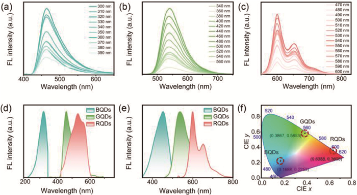 | Fig. 1. Optical properties of NO2-CQDs with blue, green, and red emissions. (a-c) PL spectra of NO2-CQDs under different excitation wavelengths. (d) Excitation spectra of NO2-CQDs at maximum emission wavelengths (BQDs: Ex = 320 nm; GQDs: Ex = 440 nm; RQDs: Ex = 540 nm). (e) Emission spectra of NO2-CQDs at optimum excitation wavelengths (BQDs: Em = 462 nm; GQDs: Em = 542 nm; RQDs: Em = 606 nm). (f) CIE 1931 chromaticity coordinates of BQDs, GQDs, and RQDs at their respective optimum excitation wavelengths. | |