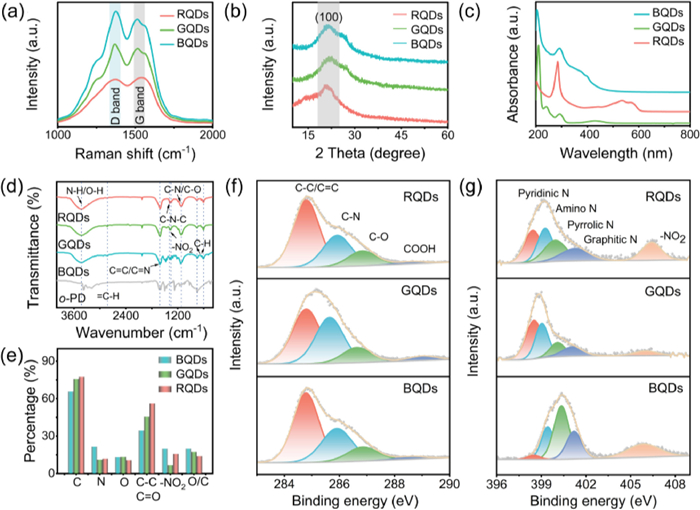 | Fig. 2. Structural characterization of NO2-CQDs. (a) Raman spectra. (b) XRD patterns. (c) UV–vis absorption spectra. (d) FTIR spectra. (e) Relative contents of functional groups on NO2-CQDs, and high-resolution XPS C 1s (f) and N 1s (g) spectra of BQDs, GQDs, and RQDs. | |