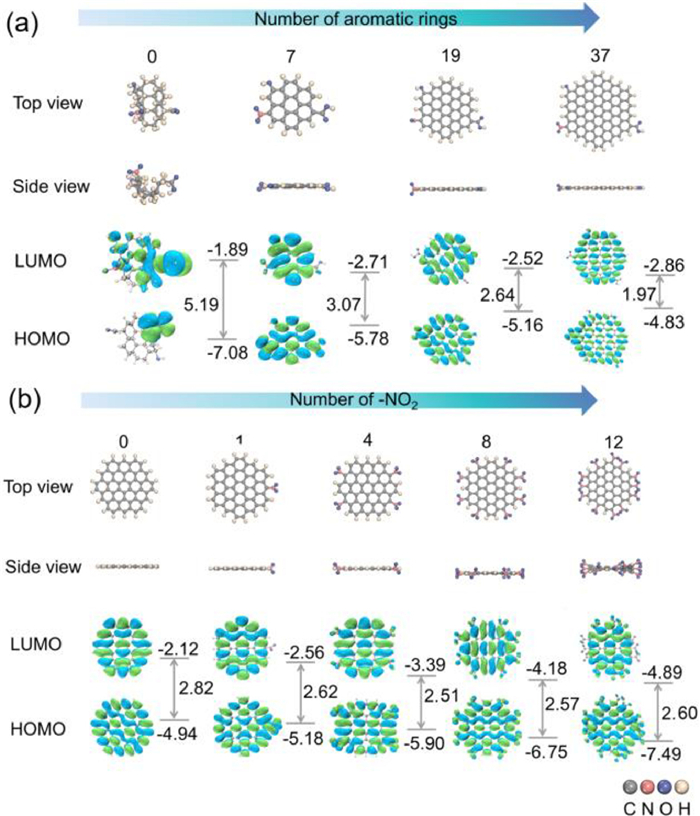 | Fig. 3. Theoretical simulation results for NO2-CQDs. (a) HOMO and LUMO orbitals of the computational model with an increasing number of aromatic rings. (b) HOMO and LUMO orbitals of the computational model with an increasing number of -NO2. | |