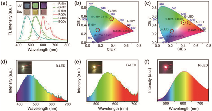 | Fig. 4. Optical properties of NO2-CQDs/PVA films and their LED applications. (a) PL spectra of NO2-CQDs/PVA films. The concentration of NO2-CQDs is 0.2 mg/mL. Inset: Photographs of NO2-CQDs/PVA films under 365 nm UV light and ambient daylight. CIE 1931 chromaticity coordinates of (b) NO2-CQDs/PVA films and (c) LED devices. (d-f) EL spectra of NO2-CQDs-based LED devices. Insets: Photographs of NO2-CQDs/PVA films in a monochromatic LED device. | |