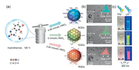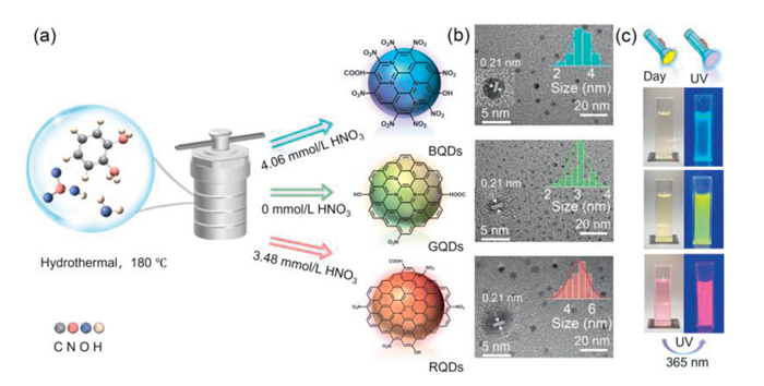 | Scheme 1. (a) Synthesis route and morphology of NO2-CQDs: BQDs, GQDs, and RQDs were prepared via hydrothermal treatment of o-PD with 4.06, 0, and 3.48 mmol/L HNO3, respectively. (b) Morphology of NO2-CQDs observed by TEM and HRTEM. Upper right inset: Particle count and size distribution; Lower left inset: HRTEM lattice fringe images (0.21 nm for all NO2-CQDs). (c) Photographs of NO2-CQDs in ethanol under daylight (left) and UV light (right). | |
