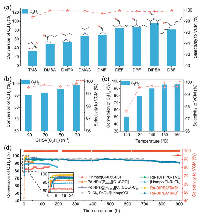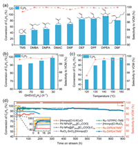 | Fig. 1. (a) Catalytic performance of Ru-Amide/TMS catalysts with different amide ligands. (b) Catalytic performance of Ru-DIPEA/TMS catalysts at different reaction temperatures. (c) Different GHSV(C2H2). (d) Stability test of Ru-DIPEA/TMS catalysts and C2H2 conversion of liquid-phase catalysts from literature. | |