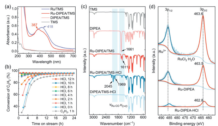 | Fig. 2. (a) UV–vis spectroscopy of Ru-DIPEA/TMS, Ru/TMS, DIPEA/TMS, and TMS. (b) C2H2 conversion of Ru-DIPEA/TMS catalysts with different HCl/C2H2 activation times. (c) FT-IR spectra and (d) Ru 3p XPS of Ru-DIPEA/TMS before and after HCl activation and other samples. | |