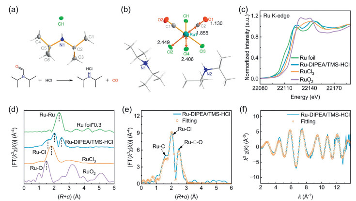 | Fig. 3. Single-crystal XRD structures of C6H15N·HCl (a) and Ru complexes (b) in Ru-DIPEA/TMS-HCl. (c) Ru K-edge X-ray absorption near-edge structure (XANES) spectra and (d) R-space extended X-ray absorption fine structure (EXAFS) spectra of the Ru K-edge of Ru foil, Ru-DIPEA/TMS-HCl, RuCl3, and RuO2 sample. Fitted curves of the Ru K-edge of Ru-DIPEA/TMS-HCl samples in (e) R-space and (f) k-space. | |