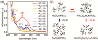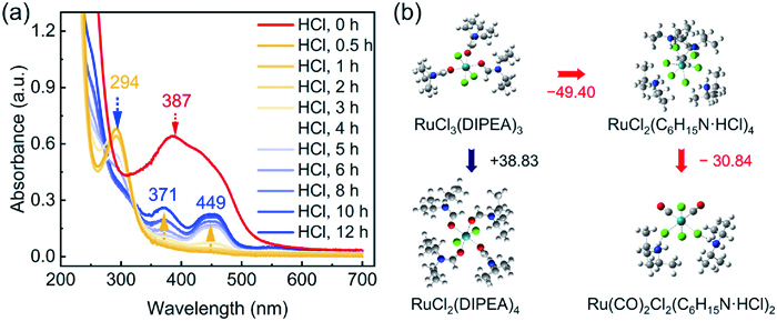 | Fig. 4. (a) UV–vis spectroscopy of Ru-DIPEA/TMS catalysts at the initial stage and at HCl activation times of 0.5–12 h (HCl, x h). (b) Formation energies (kcal/mol) of different Ru coordination structures. | |