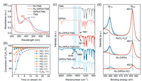 Encouraged by the above results, the synergistic mechanism of DIPEA and HCl activation on the active site structure and catalytic performance of Ru-DIPEA/TMS catalysts was systematically revealed through a series of experiments combined with multiscale characterisation. As shown in Fig. 2a, UV–vis spectra analysis revealed that TMS and DIPEA exhibited characteristic absorption peaks in the 200–250 nm range, but there was no obvious signal in the > 300 nm interval. Compared to the typical Ru3+ characteristic peak at 418 nm for Ru/TMS [24,25], the introduction of the DIPEA ligand resulted in a significant blue shift of the Ru3+ characteristic peaks of Ru-DIPEA/TMS (Δλ = 31 nm, 387 nm), which was attributed to the ligand effect between the Ru precursor and DIPEA. FT-IR spectra analysis further revealed that the sharp peak of DIPEA at 1661 cm−1 corresponded to the stretching vibration of the carbonyl group (νC=O) (Fig. 2c). In Ru-DIPEA/TMS, νC=O splits into two characteristic peaks (1661 and 1611 cm−1), and the latter shows a blue shift of 50 cm−1 [26]. This may be due to the blue shift of the characteristic νC=O peak caused by the interaction of some carbonyl groups of DIPEA with the ruthenium precursor. Taken together, the above spectra evidence confirms that DIPEA may in turn optimise its catalytic performance through the coordination of the carbonyl group with Ru3+.