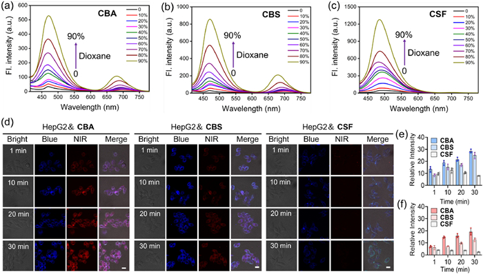 | Fig. 1. (a–c) Fluorescence spectra of CBA, CBS and CSF (10 µmol/L) in water/1,4-dioxane (1,4-dioxane volume fraction from 0 to 90%) systems (fd). λex = 400 nm, λem1 = 470 nm, λem2 = 690 nm; slit widths: 5.0 nm/5.0 nm. (d) HepG2 cells were incubated with CBA, CBS and CSF (5 µmol/L) for different times (1, 10, 20, 30 min) and then were imaged by confocal microscopy. (e) Average fluorescence intensity in the blue channel from parallel images. (f) Average fluorescence intensity in the NIR channel from parallel images. Error bars represent the standard deviation (±S.D.) with n = 3. Blue channel: λex/λem = 405/425–475 nm; NIR channel: λex/λem = 405/663–738 nm. Scale bar: 20 µm. | |