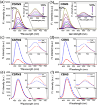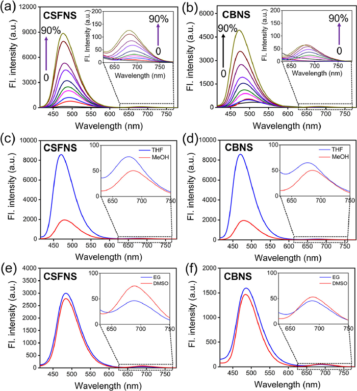 | Fig. 2. (a, b) Fluorescence spectra of CSFNS and CBNS (10 µmol/L) in water/1,4-dioxane (1,4-dioxane volume fraction from 0 to 90%) systems (fd). (c, d) Fluorescence spectra of CSFNS and CBNS (10 µmol/L) in THF and MeOH. (e, f) Fluorescence spectra of CSFNS and CBNS (10 µmol/L) in EG and DMSO; λex = 400 nm, λem1 = 490 nm, λem2 = 690 nm; slit widths: 5.0 nm/5.0 nm. | |