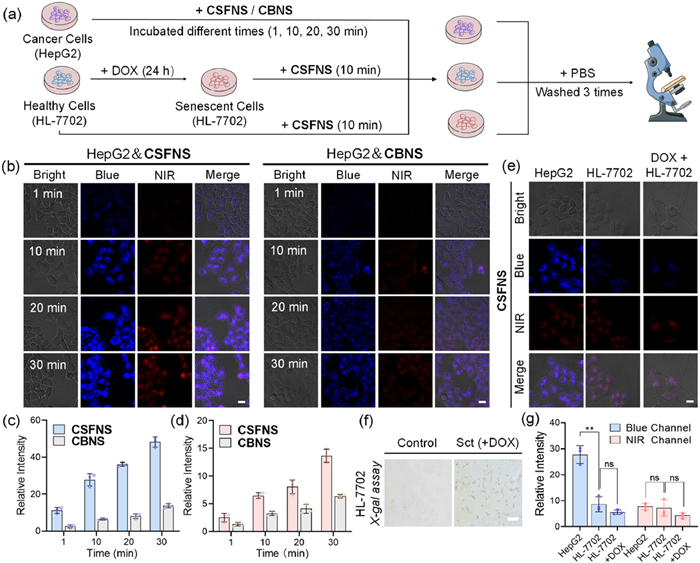 | Fig. 3. (a) The processes of cell culture and imaging. (b) HepG2 cells were incubated with CSFNS/CBNS (5 µmol/L) for different times (1, 10, 20, 30 min) and then were imaged by confocal fluorescence microscopy. (c, d) Average fluorescence intensity in the blue/NIR channel from parallel images for both probes. (e) Representative confocal imaging for HepG2, HL-7702 cells and DOX-induced senescent HL-7702 cells incubated with CSFNS (5 µmol/L) for 10 min. Scale bar: 20 µm. (f) X-gal staining images of normal HL-7702 cells and DOX-induced senescent HL-7702 cells. Scale bar: 100 µm. (g) Average fluorescence intensity in the blue/NIR channel from parallel images. Error bars represent ±S.D. with n = 3. ns, not significant. **P < 0.01 vs. HepG2 cells are analyzed with two-sided Student's t-test. Blue channel: λex/λem = 405/425–475 nm; NIR channel: λex/λem =405/663–738 nm. | |