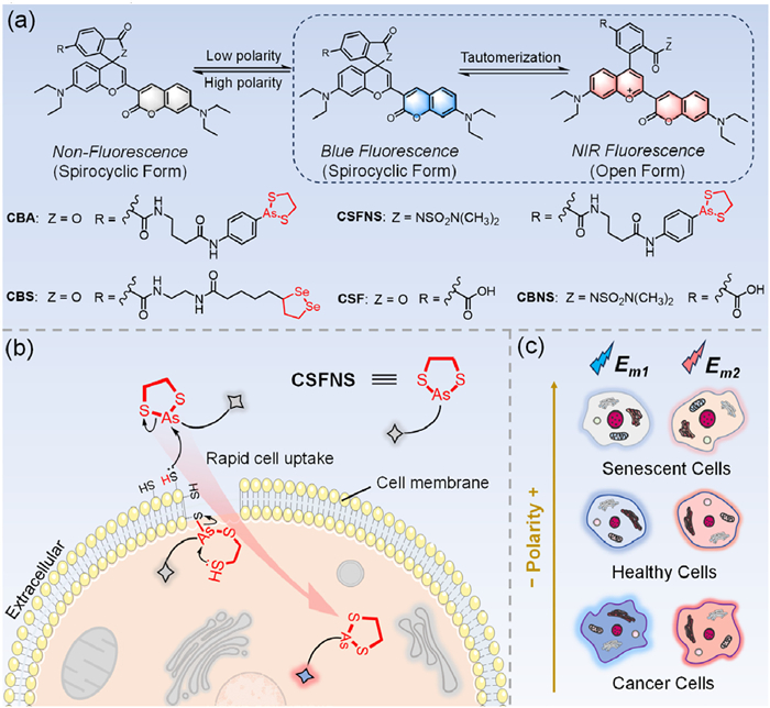 In this study, we biomimetically synthesized two dual-emissive fluorogenic dyes, CBA and CBS, which exhibit high cellular uptake rates. The coumarin-benzopyranium fluorophore (CB) was selected as scaffold, while 1,3-dithio-2-heteroarsenic cyclopentane and 1,2-diselenocyclopentane were separately introduced as the promoting cellular uptake group. The control compound, CSF, lacking the promoting cellular uptake group, was also synthesized. Subsequently, we developed a polarity-sensitive dual-emissive fluorogenic probe, CSFNS, with high cellular uptake rate and a control compound, CBNS, which also lacks the promoting cellular uptake group, by modifying the spironolactone structure of CBA into spirolactam. This modification allowed the probe molecule to effectively adjust the dynamic equilibrium between zwitterionic and spirocyclic form, pushing the equilibrium towards the spirocyclic state to enhance the sensitivity of CSFNS to polarity. Using CSFNS and CBNS in living cell confocal imaging, we reconfirmed that the 1,3-dithio-2-heteroarsenic cyclopentane effectively improved the transmembrane efficiency of probe. Furthermore, we applied CSFNS to healthy cells, drug-induced senescent cells and cancer cells to monitor polarity changes, confirming that the polarity of healthy cells is greater than that of cancer cells, and the polarity of healthy cells increases with the deepening of aging in term of overall cellular environment (Scheme 1).