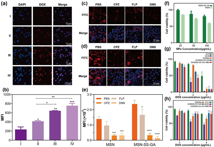 | Fig. 2. Anti-tumor effects of MSN-SS-GA in cellular level. CLSM images (a) and mean fluorescence intensity (MFI) (b) of HepG-2 cells incubated with Ⅰ: DOX, Ⅱ: D/MSN, Ⅲ: DI/MSN-SS-GA, Ⅳ: DI/MSN-SS-GA + NIR for 4 h (red fluorescence: DOX; blue fluorescence: 2-(4-amidinophenyl)−6-indolecarbamidine dihydrochloride (DAPI)). CLSM images of fluorescein isothiocyanate (FITC)-labeled MSN (c) and MSN-SS-GA (d) uptake of HepG-2 cells incubated with endocytosis inhibitors. (e) MFI of MSN and MSN-SS-GA uptake of endocytosis inhibitors. (f) Cell viability after incubation with MSN and MSN-SS-GA for 24 h. Cell viability after incubated with DOX, ICG, D/MSN, DI/MSN-SS-GA, DI/MSN-SS-GA + NIR for 24 h in HepG-2 cells (g) and 293T cells (h). Scale bar: 50 µm. P < 0.05, **P < 0.01, ***P < 0.001, ****P < 0.0001. Data are presented as mean ± SD (n = 3). | |