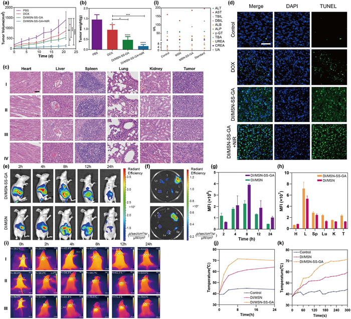| Fig. 3. Anti-tumor effect and biosafety of MSN-SS-GA in vivo. Tumor volume (a) and tumor weight (b) changes of mice after administrated with PBS, DOX, DI/MSN-SS-GA, DI/MSN-SS-GA+NIR for 21 days (n = 4). (c) H&E staining photographs of heart, liver, spleen, lung, kidney and tumor from Ⅰ: PBS, Ⅱ: DOX, Ⅲ: DI/MSN-SS-GA and Ⅳ: DI/MSN-SS-GA + NIR group. Scale bar: 50 µm. (d) TUNEL staining of tumor tissues in groups: control, DOX, DI/MSN, DI/MSN-SS-GA, DI/MSN-SS-GA+NIR. Scale bar: 50 µm. (e) Fluorescence distribution in vivo image of mice from different treatment groups (DI/MSN-SS-GA and DI/MSN). (f) Fluorescence distribution in vivo image of heart, liver, spleen, lung, kidney and tumor of mice from different treatment groups (DI/MSN-SS-GA and DI/MSN). Fluorescence distribution quantitative results of tumor intensity among 24 h (g) and tissues distribution at 24 h (h) in vivo (n = 3). Thermal images (i) and temperature elevation (j) of HepG-2 tumor-bearing mice exposed to NIR at time intervals. (k) Temperature elevation of the tumor site during the irradiation process. (l) The biochemical markers of liver and kidney in rats treated with PBS, MSN and MSN-SS-GA. Data are presented as mean ± SD. P < 0.05, **P < 0.01, ***P < 0.001, ****P < 0.0001. | |