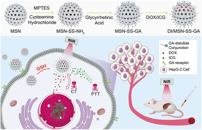 Herein, we established a versatile method to graft GA onto the nanocarrier surface via GA-disulfide conjugation, which have not been reported to the best of our knowledge, considered as a potential conjunction for wide application, endowing with accurate hepatoma cell target and sensitive GSH-stimuli drug release property. As depicted in Scheme 1, GA-disulfide conjunctions are modified on model carrier MSN by steps to construct GA-grafted MSN (MSN-SS-GA) for assessing its performance. Furtherly, doxorubicin (DOX) and indocyanine green (ICG) are loaded in MSN-SS-GA simultaneously to achieve expected chemo-PTT synergistic therapy effect.