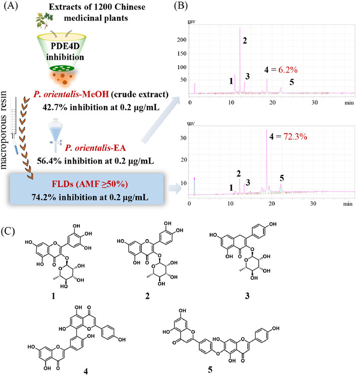 | Fig. 1. The PDE4D inhibitory screening for the Chinese medicine library led to the discovery of P. orientalis. (A) The process of discovering P. orientalis and isolating FLDs. (B) HPLC analysis of P. orientalis-EA and FLDs. (C) The chemical structures of compounds 1–5. | |