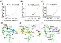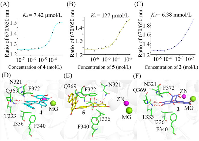 | Fig. 2. (A–C) The binding profiles of 4, 5, 2 with PDE4 were tested by MST tests and the fitted Kd values were obtained. (D) The binding pattern of 4 with PDE4 from the crystal structure as we recently reported (PDB: 8YLC). (E, F) The putative binding patterns of 5 and 2 with PDE4 from the docking results. | |
