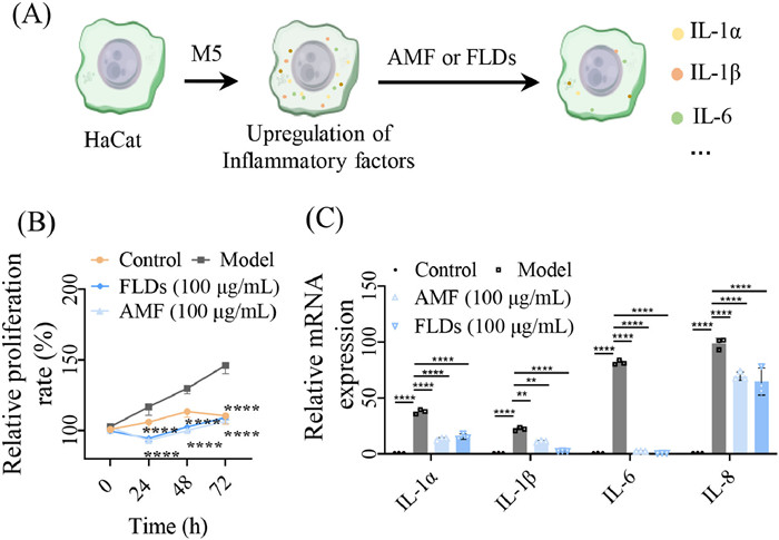 | Fig. 3. AMF or FLDs effectively inhibited hyperproliferation and inflammation in vitro. (A) Schematic illustration of the cell experimental design. (B) Cell counting kit-8 (CCK-8) assay showing the cell proliferative viabilities of different groups. (C) Quantitative real-time polymerase chain reaction (RT-qPCR) results for the inflammatory factors IL-1α, IL-1β, IL-6, and IL-8 at 24 h Data are presented as means ± standard error of mean (SEM) (n = 3 independent experiments). **P < 0.01, ****P < 0.0001. | |