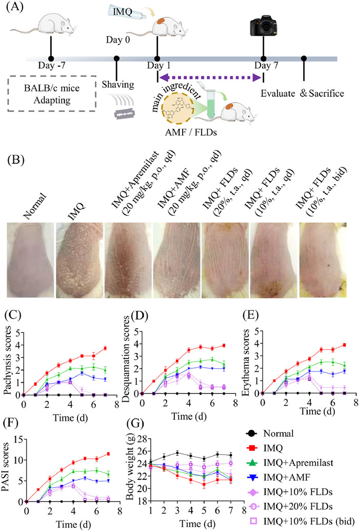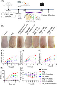 | Fig. 4. AMF and FLDs effectively alleviated the psoriasis dermatitis in vivo. (A) Schemes of the IMQ-induced psoriasiform mouse model. (B) Representative images of lesions on day 7. (C–E) Pachynsis, desquamation, and erythema of the dorsal skin were scored daily from 0 to 4. (F) The cumulative score, PASI score, as the sum of erythema, scale, and thickness scores. (G) The body weight of mice. Data are presented as means ± SEM (n = 8 independent experiments). | |