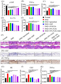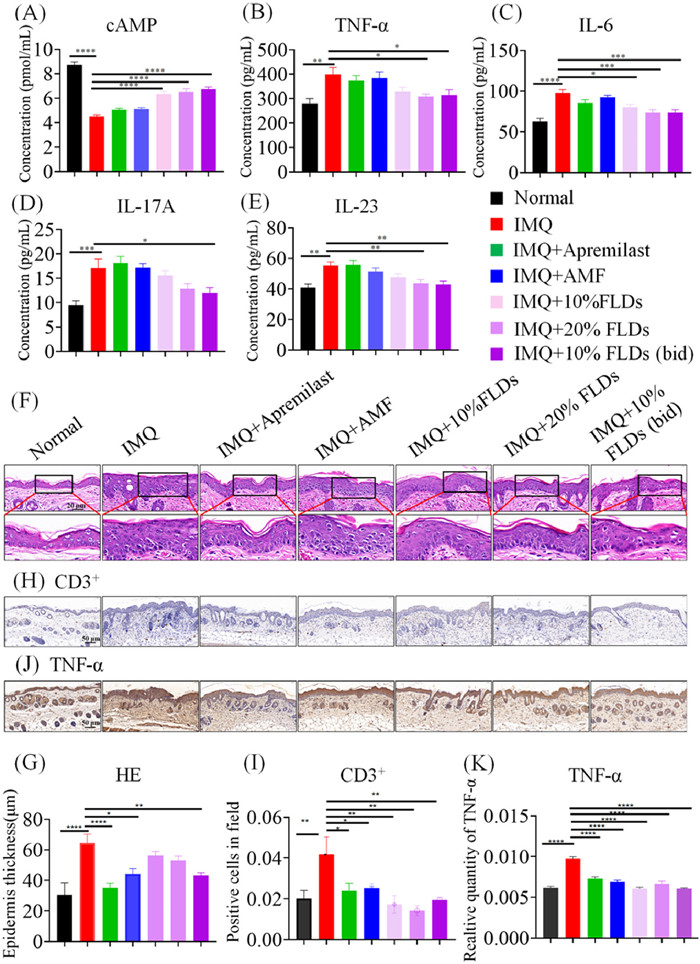 | Fig. 5. AMF and FLDs effectively increased cAMP and decreased the expression levels of several hallmark markers in psoriasis mice. (A) Enzyme linked immunosorbent assay (ELISA) quantification of cAMP. (B–E) ELISA quantification for the inflammatory factors of TNF-α, IL-6, IL-17A and IL-23. (F, G) Representative images of HE staining and the quantification of stratum corneum. Scale bar: 20 µm. (H, I) Representative images and the quantification of immunohistochemistry for CD3+. Scale bar: 50 µm. (J, K) Representative images and the quantification of immunohistochemistry for TNF-α. Scale bar: 50 µm. Data are presented as means ± SEM (n = 8 independent experiments). P < 0.05, **P < 0.01, ***P < 0.001, ****P < 0.0001. | |