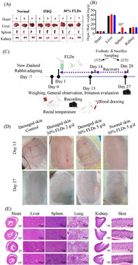 | Fig. 6. The 30% FDLs are non-irritating, safe, and nontoxic to both mice and New Zealand rabbits. (A, B) Representative images of the major organs and organ-to-body ratios in mice. Data are presented as means ± SEM (n = 3 independent experiments). P < 0.05, **P < 0.01, ***P < 0.001, ****P < 0.0001. (C) Schematic illustration of the rabbit's experiment design. (D) Photos of rabbits' skin on day 13 of drug administration and on day 27 after two weeks of recovery. (E) HE staining of major organs of rabbits after 28 days. Rows 1–4 correspond to the following groups: Damaged skin control, damaged skin 30% FLDs 2 g/d, damaged skin 30% FLDs 5 g/d, and normal skin 30% FLDs 5 g/d, respectively. Scale bar: 2 mm for heart and kidney; 500 µm for liver, spleen, lung, and skin. | |