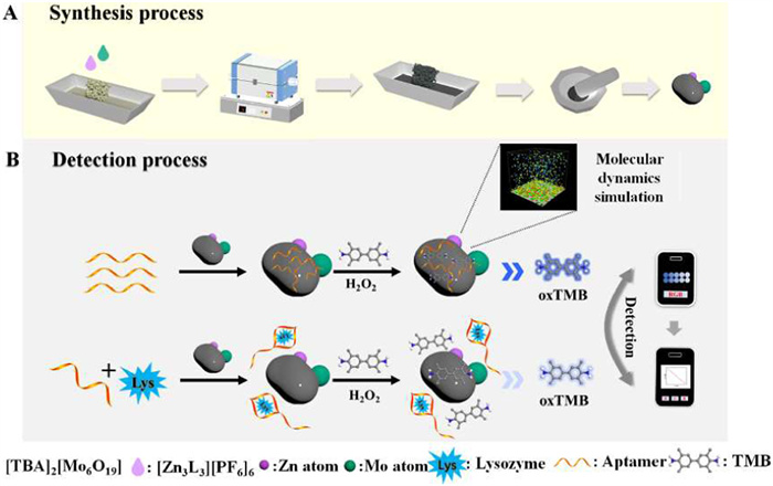 This work involved the synthesis and characterization of Mo-Zn SANs, followed by their functionalization with various DNA sequences to enhance their peroxidase-like catalytic activity. Specifically, Mo-Zn SANs were synthesized using poly(vinyl alcohol) (PVA) as a scaffold and metal precursors (polyoxometalates and supramolecular coordination complexes), subjected to controlled thermal treatment. The catalytic activity of the synthesized Mo-Zn SANs, both with and without DNA modification, was evaluated by catalyzing the oxidation of tetramethylbenzidine (TMB) in the presence of hydrogen peroxide (H2O2). DNA sequences such as lysozyme aptamer (LA) were introduced to further enhance the catalytic activity, with 300 nmol/L DNA and 0.12 mg/mL of Mo-Zn SANs used in a 10 mmol/L Tris–HCl buffer. This modification significantly improved the reaction rate, with optimized conditions including an acetate buffer (pH 3.5) and a temperature of 42 ℃. Detailed characterization using techniques like high-angle annular dark-field scanning transmission electron microscopy (HAADF-STEM) and X-ray photoelectron spectroscopy (XPS) confirmed the uniform dispersion of single atoms and their catalytic potential. The comprehensive description of the experimental procedures and conditions can be found in Supporting information.