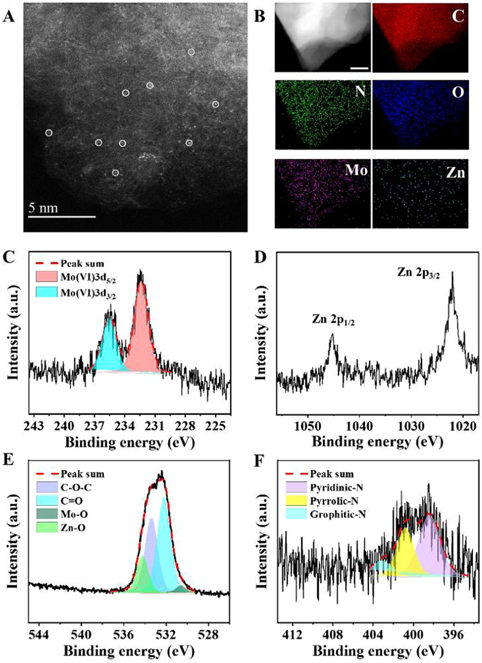 | Fig. 2. Comprehensive characterization of Mo-Zn SANs. (A) HAADF-STEM image displaying the uniform distribution of single atoms, critical for achieving precise enzymatic activity. (B) EDS mapping, confirming the homogeneous elemental composition (The scale bar represents 100 nm). (C-F) XPS results, detailing the oxidation states and chemical environment of Mo and Zn atoms, supporting the structural integrity and catalytic potential of the SANs. | |