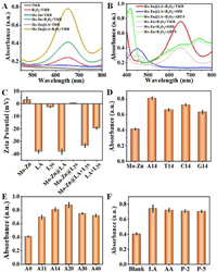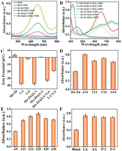 | Fig. 3. Catalytic performance evaluation of Mo-Zn SANs enhanced by LA. (A) Enhanced POD activity demonstrated by the increased absorbance at 652 nm, showing the oxidation of TMB in the presence of H2O2, significantly boosted by LA. (B) Interaction of Mo-Zn SANs with additional chromogenic substrates, ABTS and OPD, with absorbance peaks at 420 nm and 450 nm respectively, illustrating diverse catalytic capacities. (C) Zeta potential measurements indicating electrostatic interactions between Mo-Zn SANs, LA, and lysozyme, which modulate the system's catalytic efficiency through charge-related mechanisms. (D) Assessment of the impact of various DNA sequences on the POD activity of the nanozymes, demonstrating how base-specific interactions influence catalytic efficiency. (E) Analysis of the effect of DNA sequence length on enzymatic activity, showing optimal catalytic enhancement with sequences around 20 bases in length. (F) Broad evaluation of enzymatic activity enhancement across diverse DNA sequences, indicating non-specific adsorptive interactions that enable versatile biosensing applications. | |